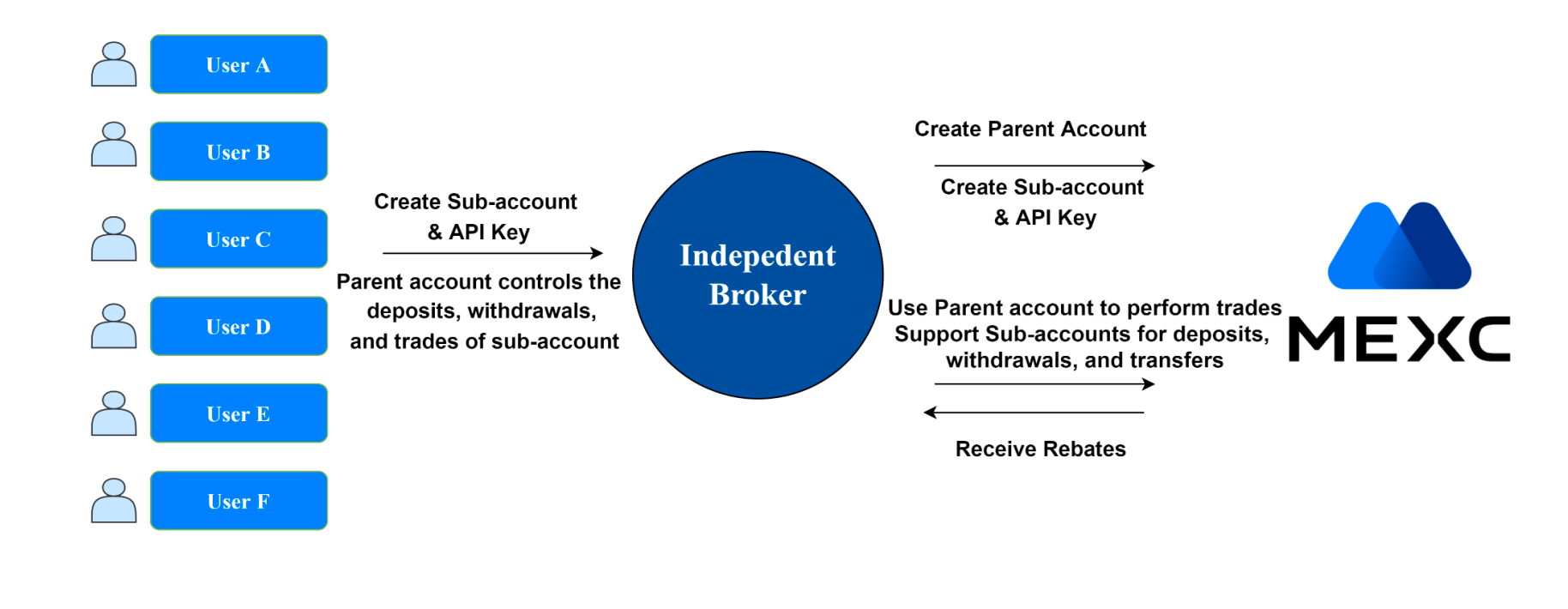 This includes wallet platforms, market data platforms, aggregation trading platforms, stockbrokers, as well as stock and securities trading platforms, etc., all of which have their own independent users. MEXC can provide order matching systems, account management systems, settlement systems, as well as main and sub-account systems, etc. Independent brokers can share the trading fluidity and depth over the MEXC platform and receive profit shares from fees.