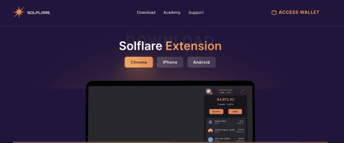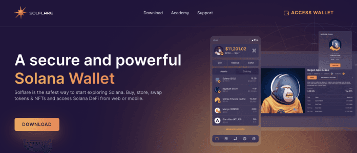 ①Solflare ウォレットの公式サイトにアクセスし、トップページにある「DOWNLOAD」ボタンをクリックします。