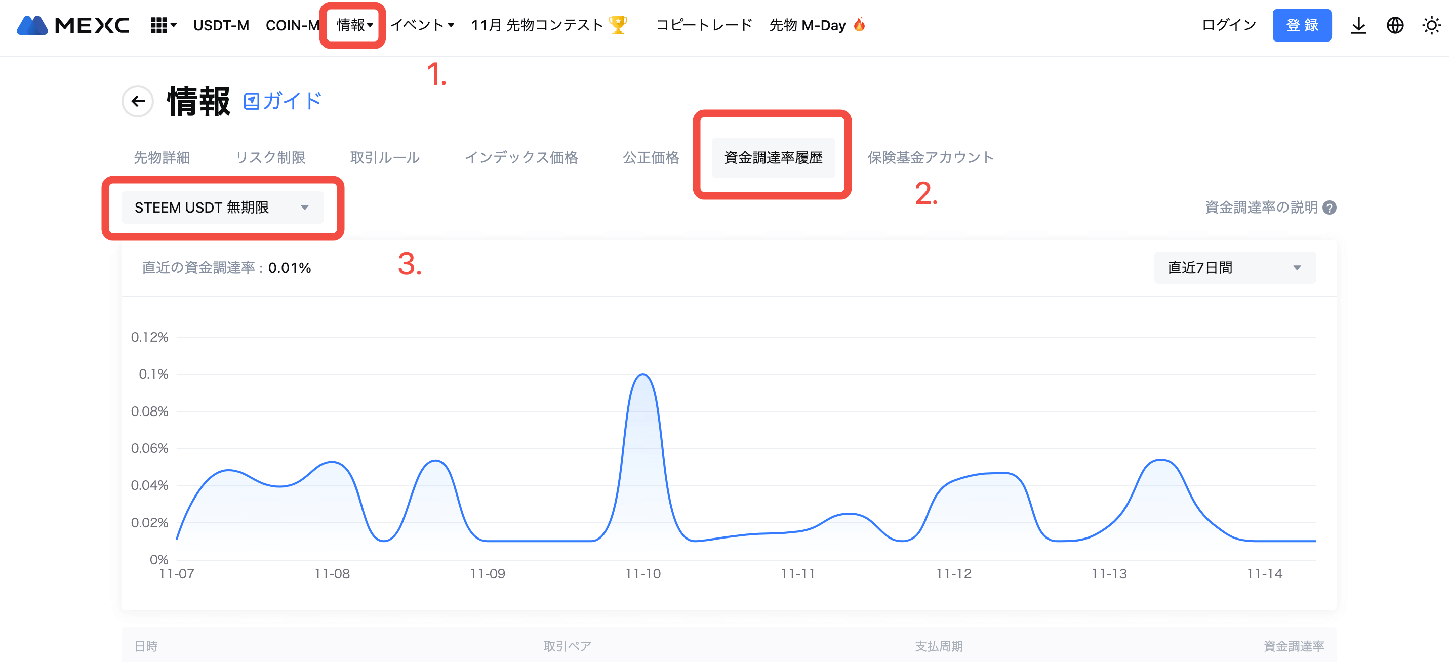 日時 (日本時間) | STEEMUSDT 先物最大資金調達率 |