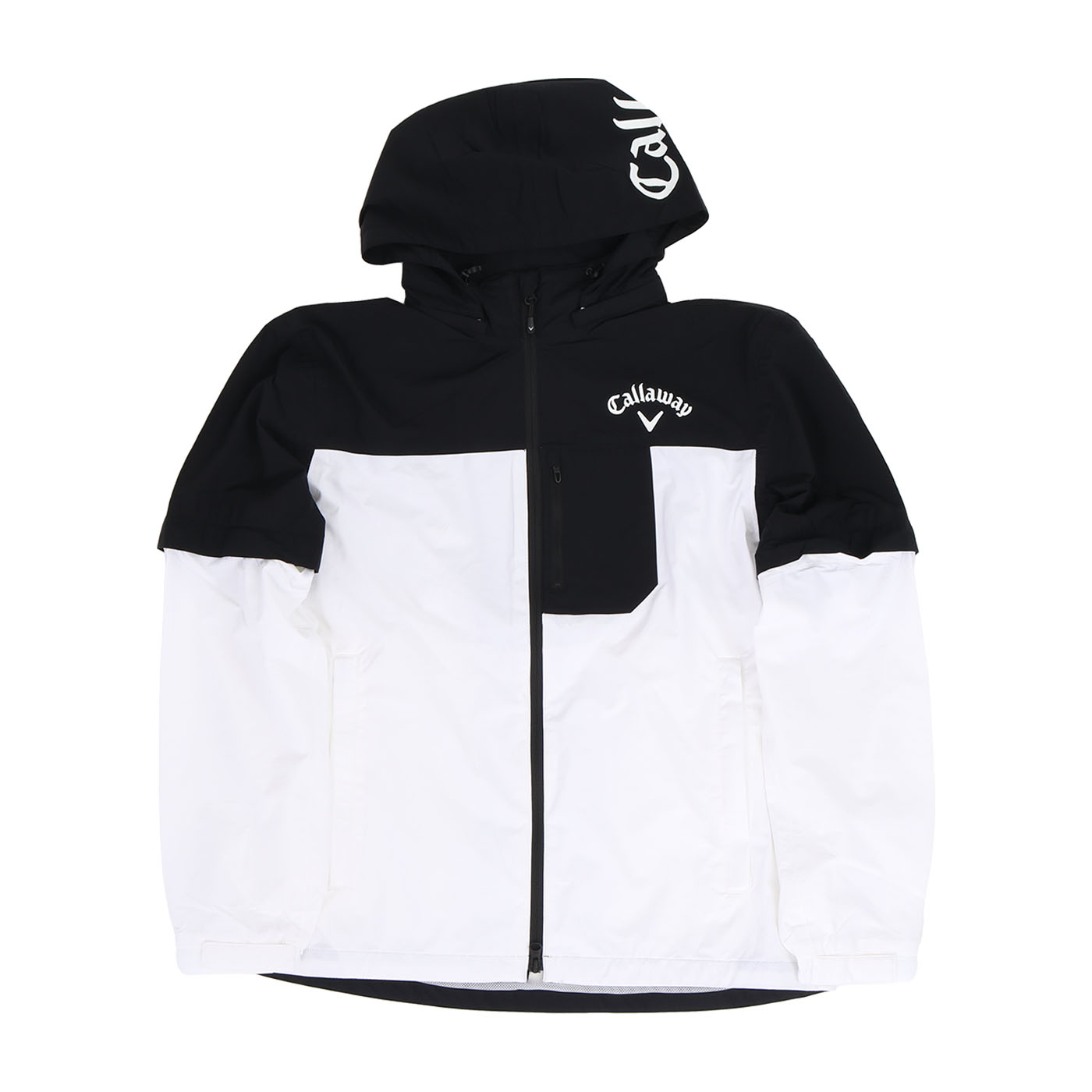 キャロウェイの「セットアップ レインウェア」は、性能や機能性はもちろん、おしゃれに着こなせるものを探している人におすすめです。全体的に性能・機能のバランスがとれた商品。耐水圧の計測値は26,013mm(実測・参考値)と防水性は高く、縫い目の防水も問題ありません。大雨の日のラウンドでも、水の侵入をしっかりブロックできそうです。縦横にストレッチが効いているので、生地のツッパリ感がありません。ほどよくフィットして、テークバックの際も窮屈さを感じにくい印象です。ガサガサという音もそれほど気にならないので、スイングの妨げにはならないでしょう。蒸れにくいのも魅力のひとつです。透湿性の計測では6,576g/m2/24hを記録し、背中には内部の湿気を排出するためのベンチレーションもついています。ベルトループがあり、長さの調節や半袖・半ズボンへの切替も可能で、コーディネートの幅が広がります。生地の性能も高く、機能面も充実した優等生的なレインウェア。フードに大きく入ったロゴが特徴的で、見た目が好みなら有力な候補となるでしょう。