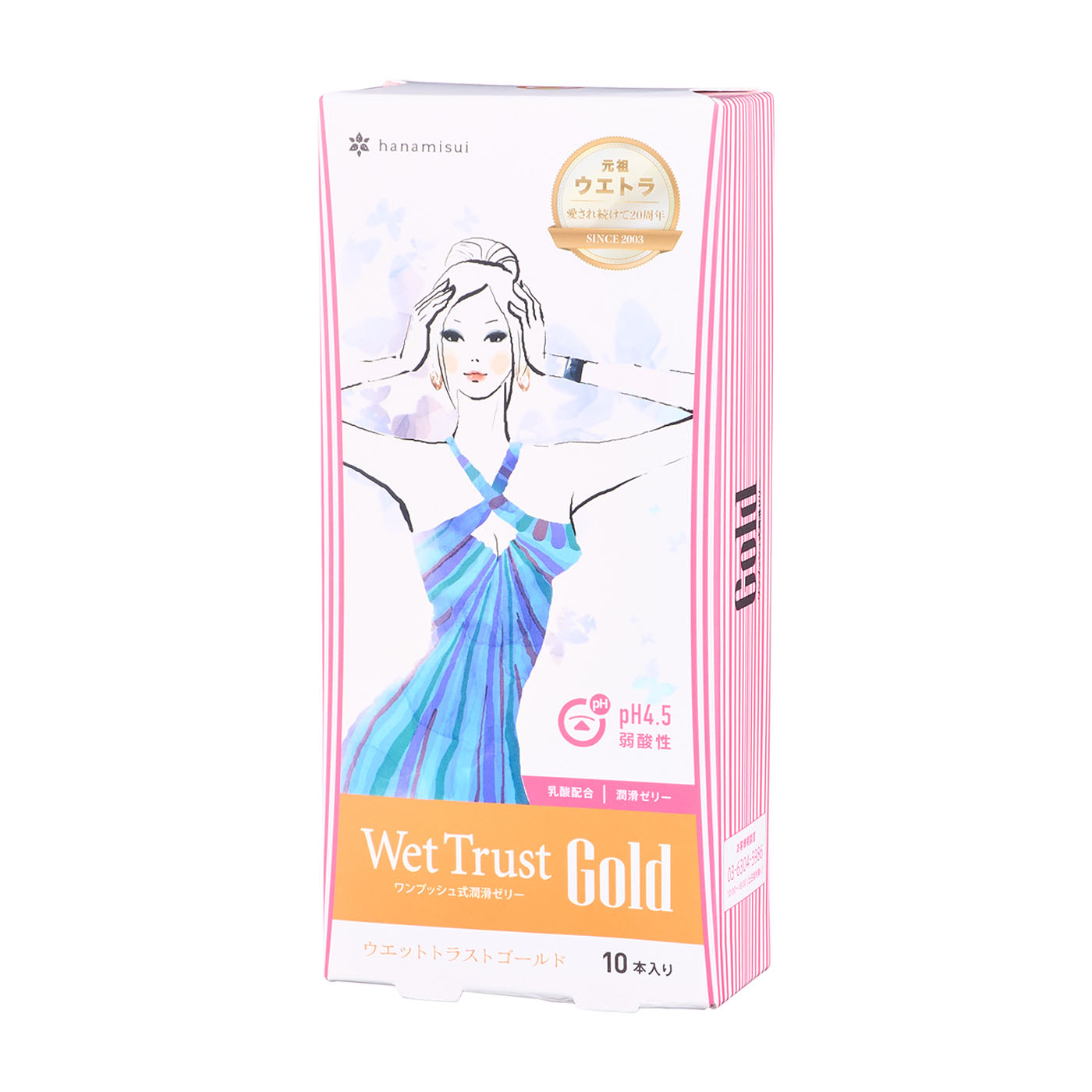 ハナミスイの「ウェットトラストゴールド」は、性行為中の痛みに悩んでいるけれどパートナーに伝えづらい人におすすめ。個包装で持ち運びしやすいうえにゼリーを手に取ることなくサッと使えるので、パートナーにバレずに使用できるでしょう。液だれしにくくゆっくりと垂れるため、塗布するときにベッドを汚すリスクも低いといえます。やや硬めのテクスチャで伸ばしづらいものの、体温で溶けるとさらっとなじむのもうれしいポイント。使用中にヒリつきを感じたモニターはいなかったうえ、「少量でもなめらかに指が滑った」というプラスの声が挙がりました。塗布したゼリーを15分間放置してもうるおいをキープできたため、行為中に乾く心配も少ないといえます。香りもほとんどなく、体液に近い感覚で使用できるでしょう。また、ぬるま湯を当てると手で撫でなくてもスルスルと落ちたので、片づけに時間がかからないのもメリット。加えて洗い流し不要なので、行為が終わってからもパートナーとゆっくりできますよ。