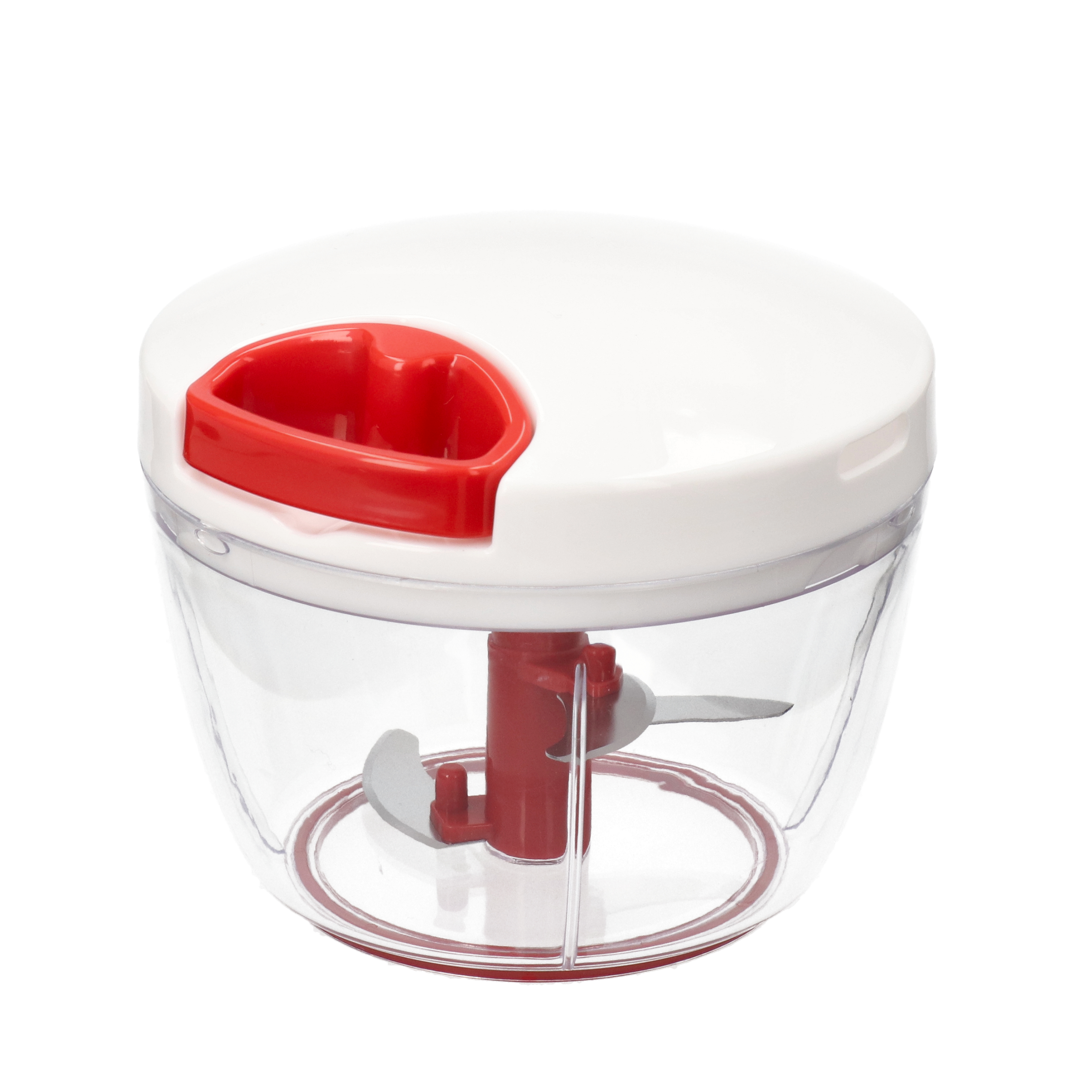 赤いハンドルと軸が特徴の、ケイ・アンド・エーの「ぶんぶんチョッパーR」。従来品より容器の形状をフラットにしたと謳っている商品です。どの食材も20回ひもを引けば粗みじんになり、素早くみじん切りできた印象です。容器の底面に滑り止め、フタにロック機能がついているので、思い切りひもを引いてもずれたり食材がこぼれたりしませんでした。フタには水抜き穴があり、水が入り込んでも排水しやすいでしょう。穴を下にしておけば乾きやすく、清潔に保ちやすい印象。食洗機には対応していませんが、フタが丸洗い可能で濡れ布巾などで拭く必要はないので、手入れの手間は比較的少ないといえます。容量は約640mLで、中サイズのたまねぎ1個をみじん切りできる大きさ。作り置き分も作りたいけれど、収納しやすいものがほしいという人にぴったりの商品です。