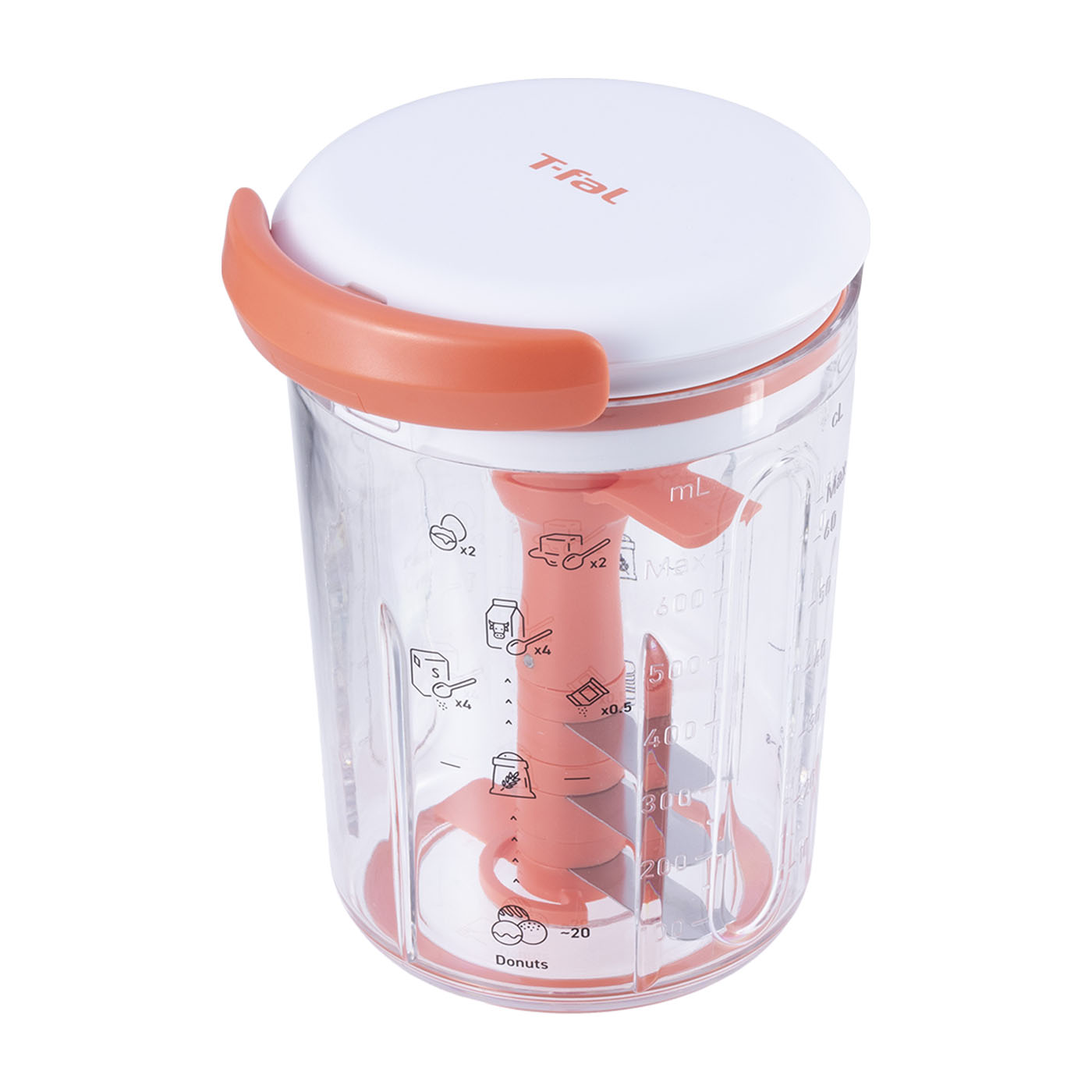 T-fal(ティファール)でおなじみの、グループセブジャパンの「ハンディチョッパー&ミキシング エクスプレス」は、みじん切りや手入れを楽にしたい人におすすめです。実際に食材を入れたところ、たまねぎ・ニンニクは20回・にんじんは10回ほどでほぼ均一なみじん切りに。少ない回数でも全体にしっかり刃が入り、スピーディに刻めました。刻みやすさにも秀でています。ハンドルが握りやすくてひもを引きやすいうえ、底には円形で全周に滑り止めがあり、安定感があるのもポイント。フタを2cmほど回すとロックがかかるので、作業中に滑ったり食材がこぼれたりするリスクが低く、手軽に使えます。フタの水抜き穴つきで、丸洗いできる点が魅力。フタ内部に水が入った場合にはそのままにせず、フタを開けてよく乾燥させてくださいね。フタ以外のパーツは食洗機にも対応しており、食洗機がある家庭では手洗いの手間を軽減できるでしょう。ブレンダーは付属していませんが、別々に動く3枚の刃で撹拌もできると謳っています。容量900mLとたっぷり入り、注ぎ口がついているので、混ぜた生地をボウルにも移し替えやすいでしょう。パンケーキや粉物料理などの生地を、だまのない仕上がりにしたい人にもぴったりです。