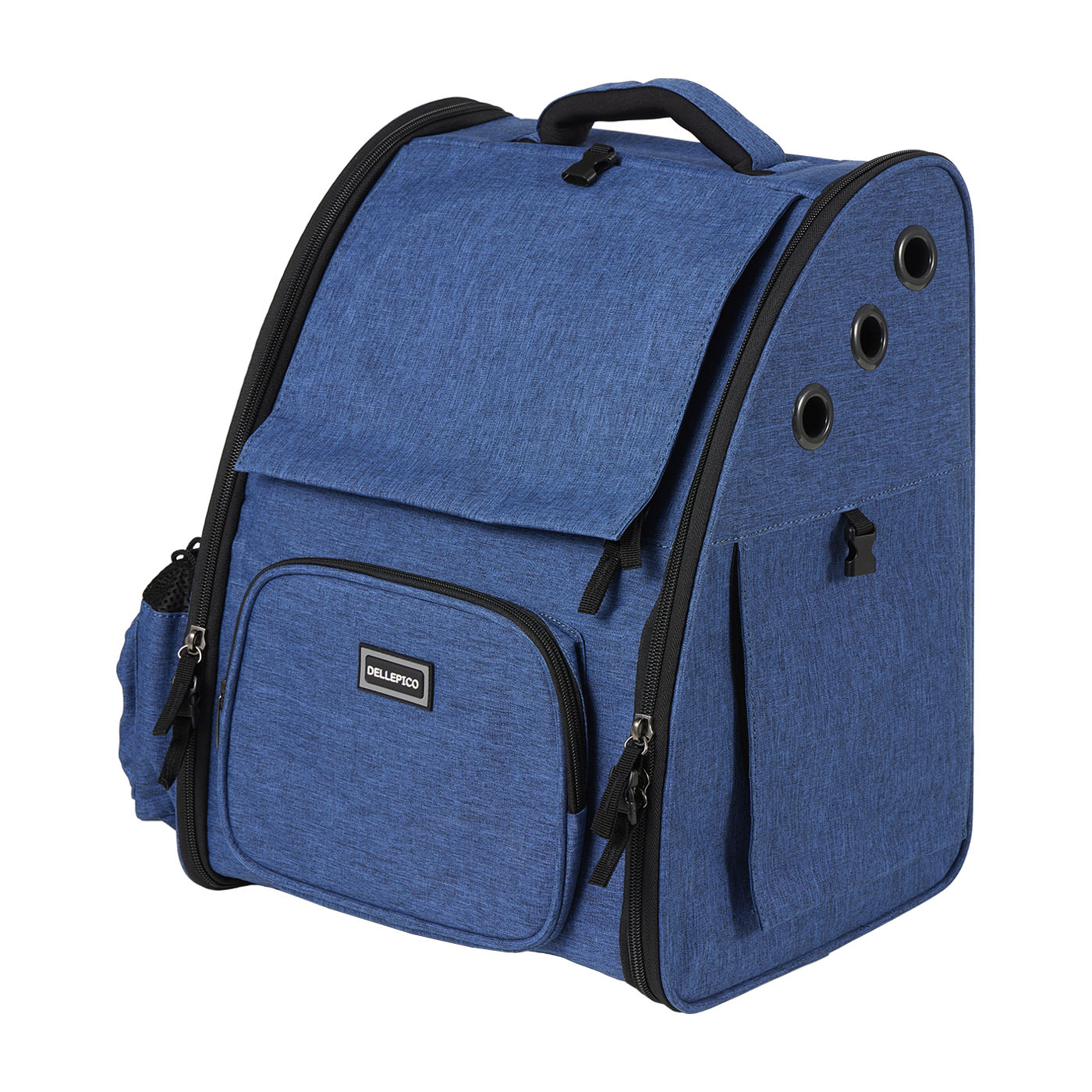 Kom&Komの「DELLEPICO ペット用リュック」は、バッグやリュックの中に猫を入れるのに苦戦してしまう人におすすめ。上に窓があり、猫を上から入れられます。猫が逃げにくく、スムーズに入れやすいでしょう。片側はメッシュ窓を閉じられませんが、猫が伏せれば隠れられるスペースは確保されています。外から見えにくいので、猫がリラックスしやすいでしょう。左右両面と前面にメッシュ窓があり、通気性も良好といえます。ソフトタイプなので、使わないときはコンパクトに折りたためる点もメリット。下敷きは取り外してお手入れできます。その一方、背負ったときに腰に負担がかかりやすいのはネックです。クッションは底面の腰があたる部分までカバーしきれず、モニターからは「ゴツゴツした感触を強く受ける」「底面の角が腰にあたる」との声が寄せられました。リュックの前面中間にはフレームがあり、外部から衝撃が加わっても型崩れしにくいのは魅力。猫を入れた状態で持ち手を持ち上げても上面はほぼたわまないので、猫のスペースを確保できます。また、長さ13~23cmに調節可能な飛び出し防止リードを備え、ファスナーの両サイドはバックルでロック可能。猫が脱走しにくいといえます。背負いやすさに難はあるものの、お出掛け慣れしていない猫をスムーズにリュックに入れられるのは魅力。耐荷重が13kgと大きめで、長く使えそうです。猫飼い初心者はぜひチェックしてください。