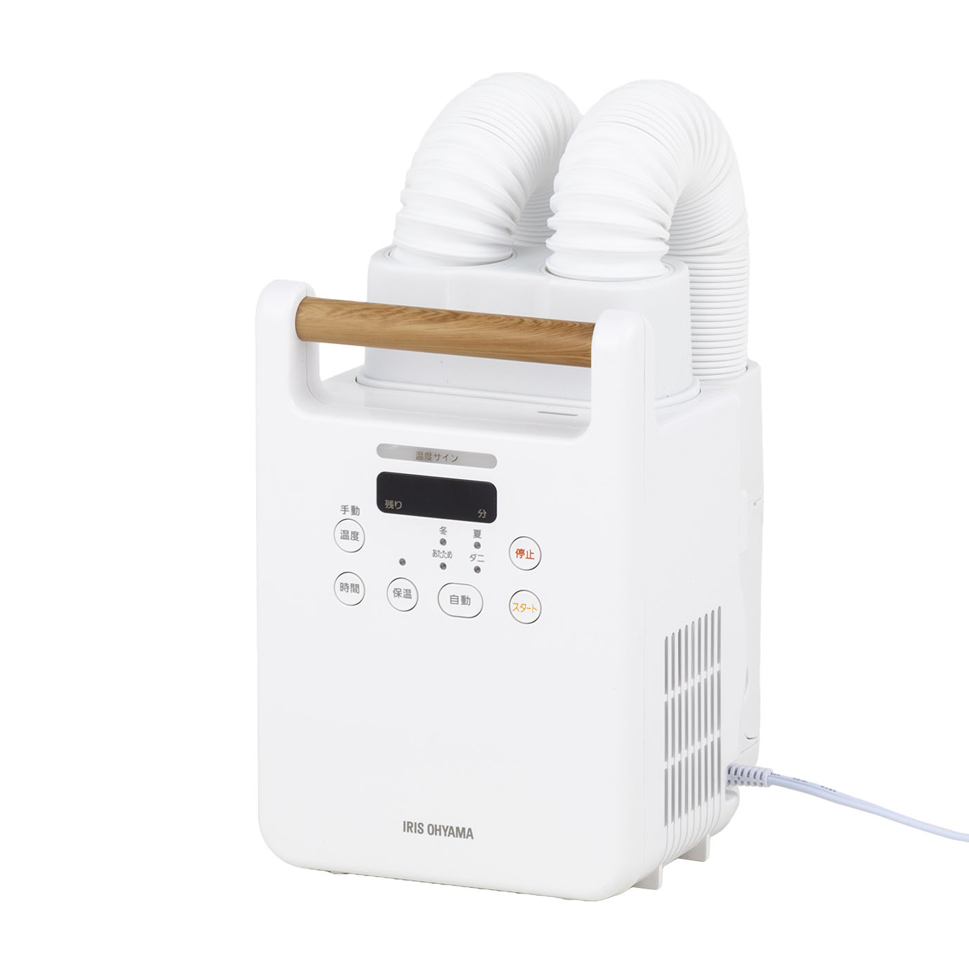 アイリスオーヤマの「カラリエ ふとん乾燥機ツインノズル FK-W2-W」は、家族で使いたい人におすすめです。ツインノズル搭載で同時に2つの布団に使用でき、家族が多くても短時間で乾燥可能。布団サイズは、シングル・セミダブル・ダブルに対応しています。寝汗を想定した水をシーツに含ませてから乾燥させると、使用後は約166gも軽くなっていました。足元のほうは乾ききっていませんが、おおむね乾燥させられたのでカビが発生するリスクを軽減できます。温め機能は高性能で、あたためコースを使用すると、頭・背中・足付近の温度は40℃以上を記録しました。布団内部が広範囲にしっかり温まったので、寒い時期でもぬくぬくとした布団で眠りやすいといえます。ダニ対策コースを使用して温度・時間を計測すると、ほとんどの場所でダニが死滅する環境を維持しました。一部の場所ではダニ対策に有効な条件を満たせませんでしたが、定期的に稼動させるなど工夫すれば問題ないでしょう。コースは冬・夏・あたため・ダニの4種類を搭載し、用途に合わせて選択できます。靴乾燥用ノズルも付属し、布団以外に活用できるのもポイント。コンセントは一体収納できないものの、片づけはホースを縮めるだけと簡単です。稼動音は60.6dBと大きめだったので、静かな場所だと風の音が気になるかもしれません。静音性重視の人には不向きですが、布団の数が多くてもスピーディに温められるので、効率よく布団を温めたい人はぜひ検討してください。