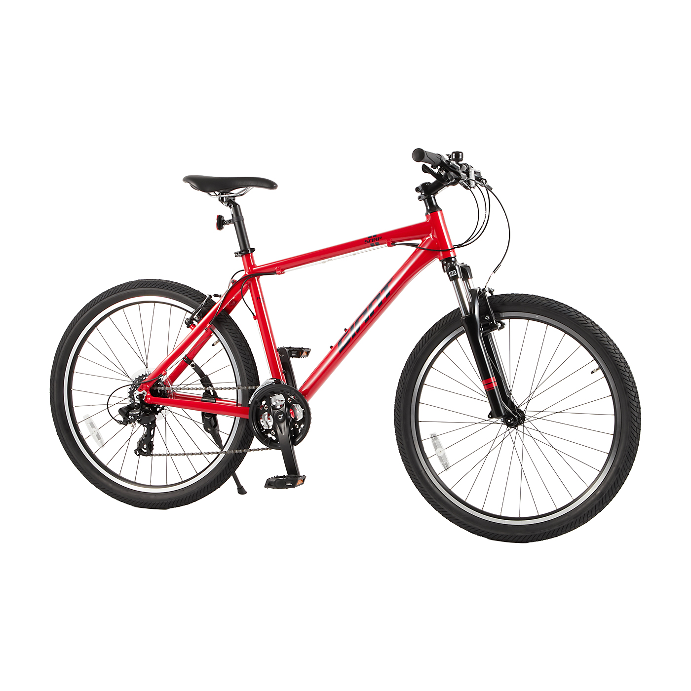 XLEATの「マウンテンバイク 」は、バーエンドバー(ハンドルの両端に取り付ける追加の持ち手)を標準装備している点が特徴的な1台です。実測で16.5kgと車体重量が非常に重く、走りの軽快さの検証では低い評価となりました。サスペンションは負荷がかかると簡単にたわみやすいため丈夫とはいえないでしょう。ブレーキは機械式ディスクブレーキを装備。検証では高いブレーキ力とはいきませんでしたが、舗装路を走るうえでは問題ないレベルでしょう。フロント3段・リア7段の変速ギアとトリガーシフトを備えていますが、変速の調整がズレやすかったため変速のしやすさは低評価となりました。スタンド・ディレイラーガードを備えており、日常使いのしやすさに配慮されていますが、ハンドル幅が600mmを超えており、道交法により歩道の走行ができません。スポーツ車系規格のパーツはあまり使われておらず、カスタムしやすいとはいえない点はネックです。