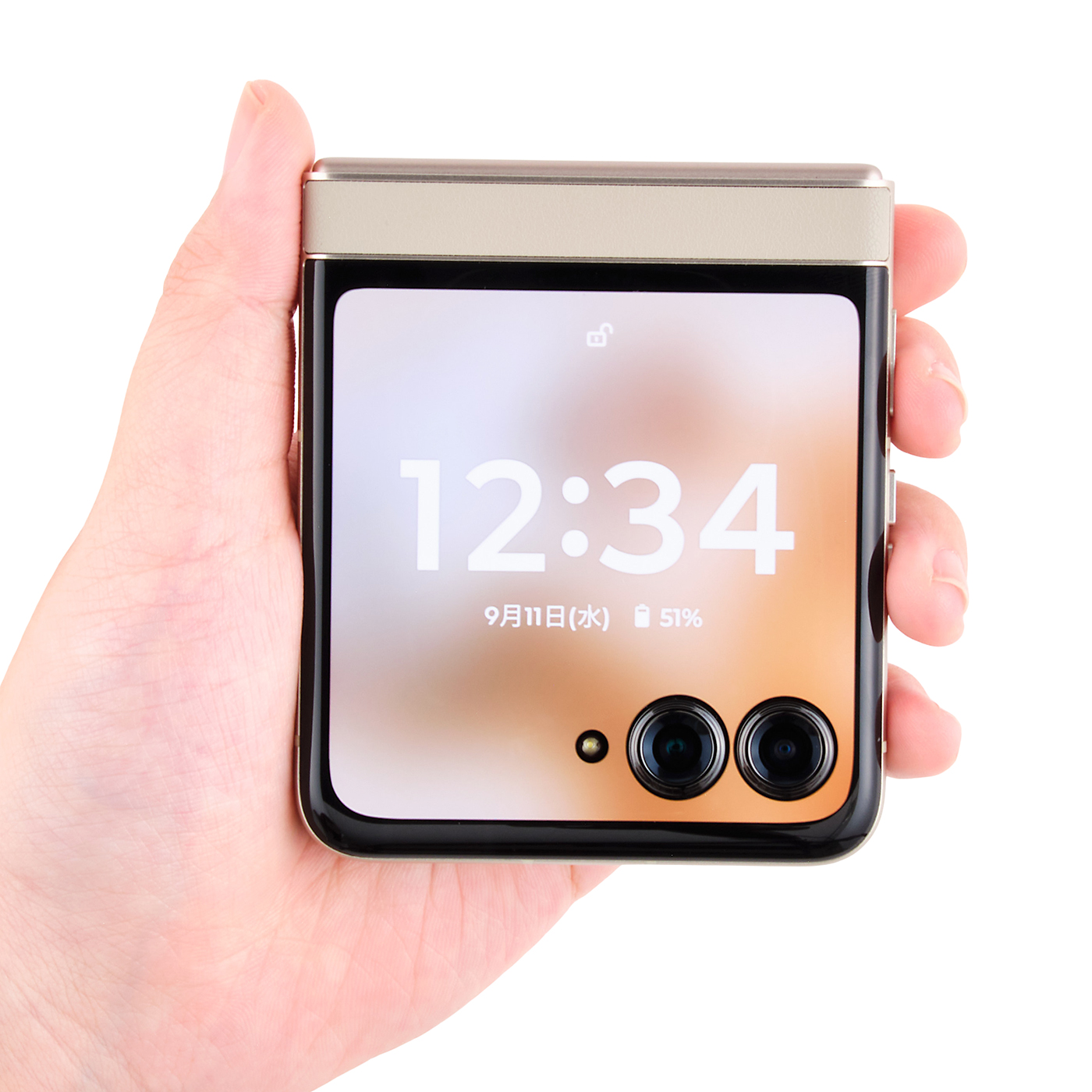 モトローラ・モビリティ・ジャパンの「razr 50」は、閉じたままでもいろいろ操作できるフリップ(縦折り)スマホを探している人におすすめです。ソフトバンクからは「razr 50s」として販売されています。スマホを閉じた状態でも、アウトカメラを使った自撮りが可能。カメラの起動はサイドボタンを2回押すか、手首を素早く2回ひねるだけでも可能なため、撮りたいときはすぐに撮影できます。カメラ性能は高めの評価で、実際に自撮り写真を見たモニターからは「肌質や髪の毛の細部がはっきり映し出されている」との声が挙がりました。ズーム撮影でギザギザ感が強く出てしまうのは気になりますが、暗所での撮影も「ノイズのないさらっとした色の変化が再現できている」と高評価。ディスプレイは有機ELで色が鮮やかで、リフレッシュレートも最大120Hzと滑らかです。サブディスプレイの画面は大きい3.6インチと、見やすいサイズも魅力。さらに閉じた状態で使えるアプリに制約はありません。検索を行ったり、YouTubeで動画を見たりと、閉じたままでも問題なく使いこなせます。また、フル充電の状態から20%まで減るのにかかる時間は12時間29分と長く、バッテリー持ちも十分です。サーモカメラを使った熱のこもりにくさの検証では、負荷をかけたときの本体温度は41.9℃と、比較的抑えられていました。ただし、処理性能は今回比較したスマホのなかでも低く、処理性能を表すベンチマークスコアは約68万点。約123万点だった同社の「razr 50 ultra」よりも劣る結果です。IPX8の防水性能もあり、バッテリー持ちもよいので、1日中持ち歩いて活用したい人にぴったり。コンパクトなうえに本体重量は188gと非常に軽量で、持ち運びしやすいのも利点です。折りたたみ状態でそのまま利用したいなら、ぜひ検討してみてくださいね。