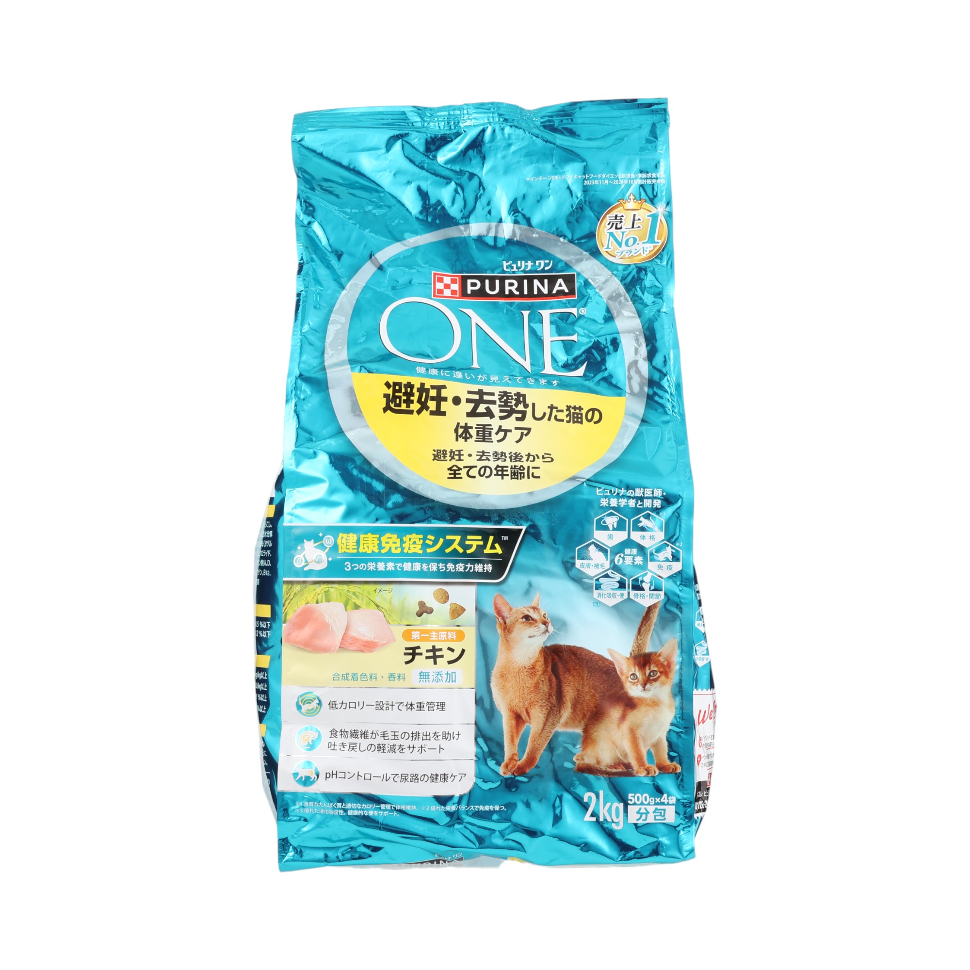 「PURINA ONE 避妊・去勢した猫の体重ケア 避妊・去勢後から全ての年齢に」は、ネスレ日本が提供するキャットフード。合成着色料無添加で避妊・去勢後の猫の体重管理に特化した低カロリー設計、下部尿路の健康維持、健康サポートによる免疫維持、食物繊維を配合した毛玉ケアなど多機能を備えています。