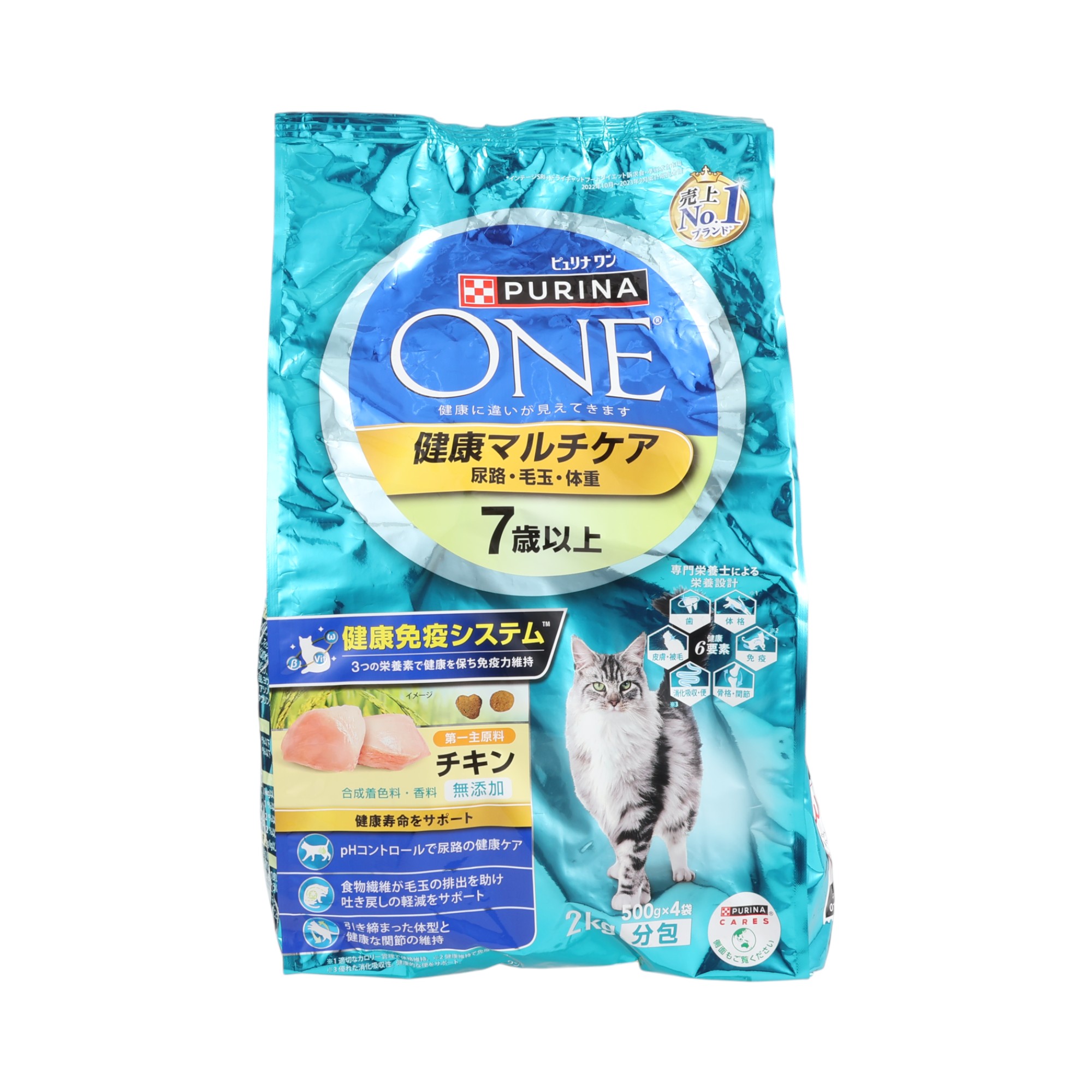 「PURINA ONE 7歳以上 健康マルチケア」は、ネスレ日本が提供するキャットフード。7歳以上の猫向けに、下部尿路の健康維持や食物繊維による毛玉ケア、適切な栄養設計による体重管理などの健康要素を総合的にケアできるよう設計されています。チキンを主原料としながら、オメガ6脂肪酸やオメガ3脂肪酸、βグルカンなどをバランスよく配合しているのが特徴です。