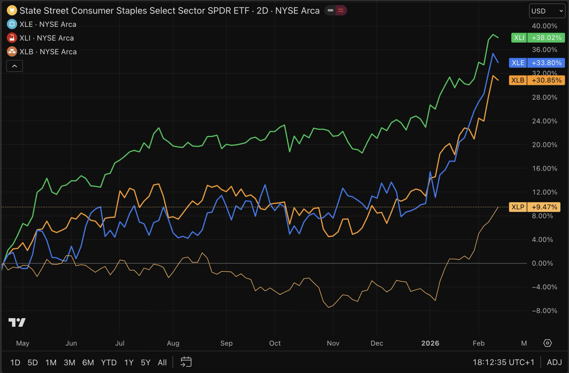 Beleggers kiezen voor de relatieve veiligheid van tastbare beleggingen. Goud deed het natuurlijk al goed, maar ook de industrie, materialen, energie en essentiële consumptiegoederen presteerden de afgelopen maanden, en met name vanaf de start van 2026, sterk.
