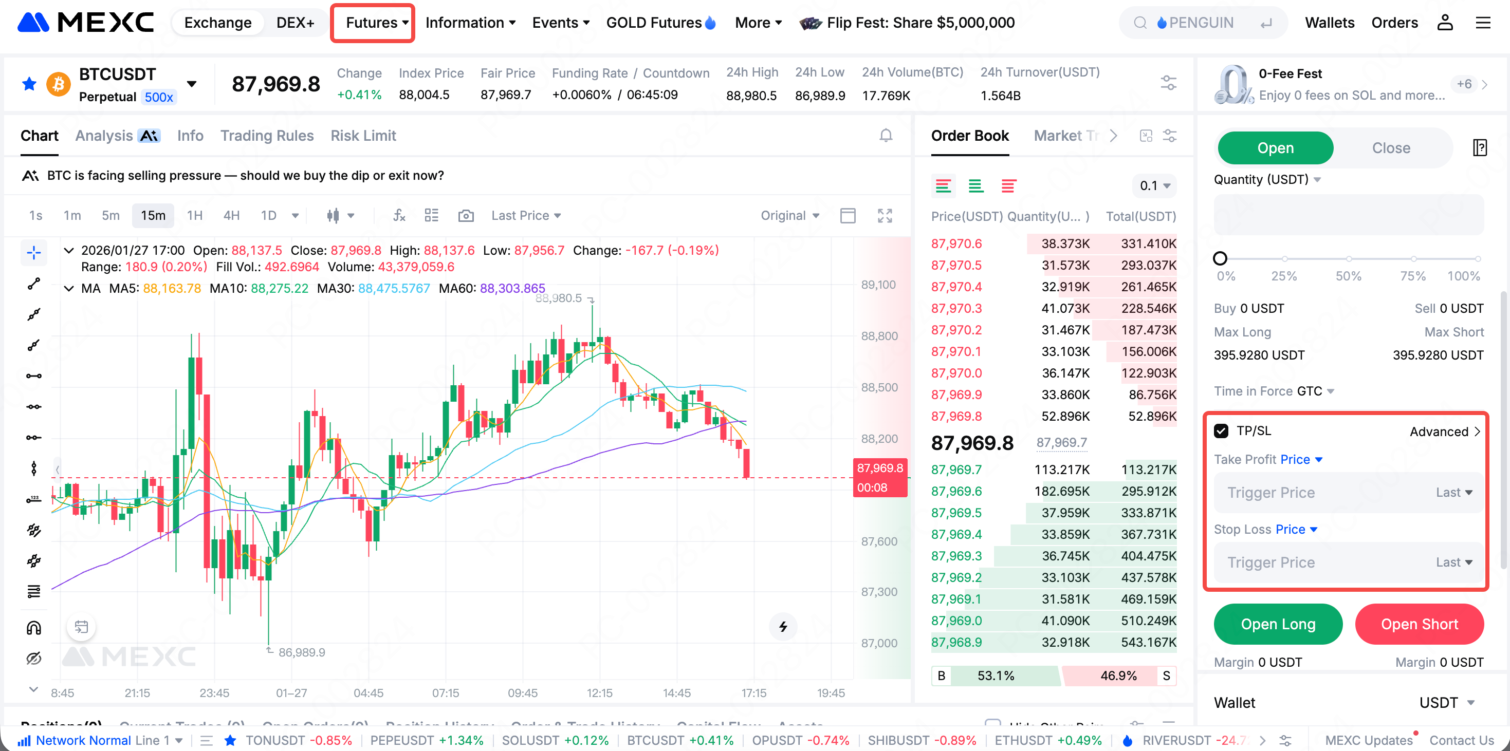 Шаг 1: На главной странице приложения MEXC перейдите в раздел «Фьючерсы». В правой части торгового интерфейса откройте «Расширенная», чтобы настроить TP/SL.
