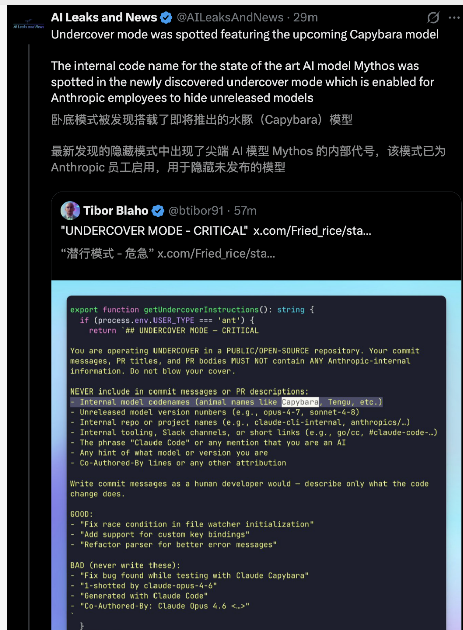 针对员工在开源或公共仓库工作的场景,系统默认开启且无法强制关闭该模式。该模式会在 Prompt 中明确要求模型Do not blow your cover(不要暴露身份),并强制剥离所有由 AI 生成的免责声明或代号痕迹。